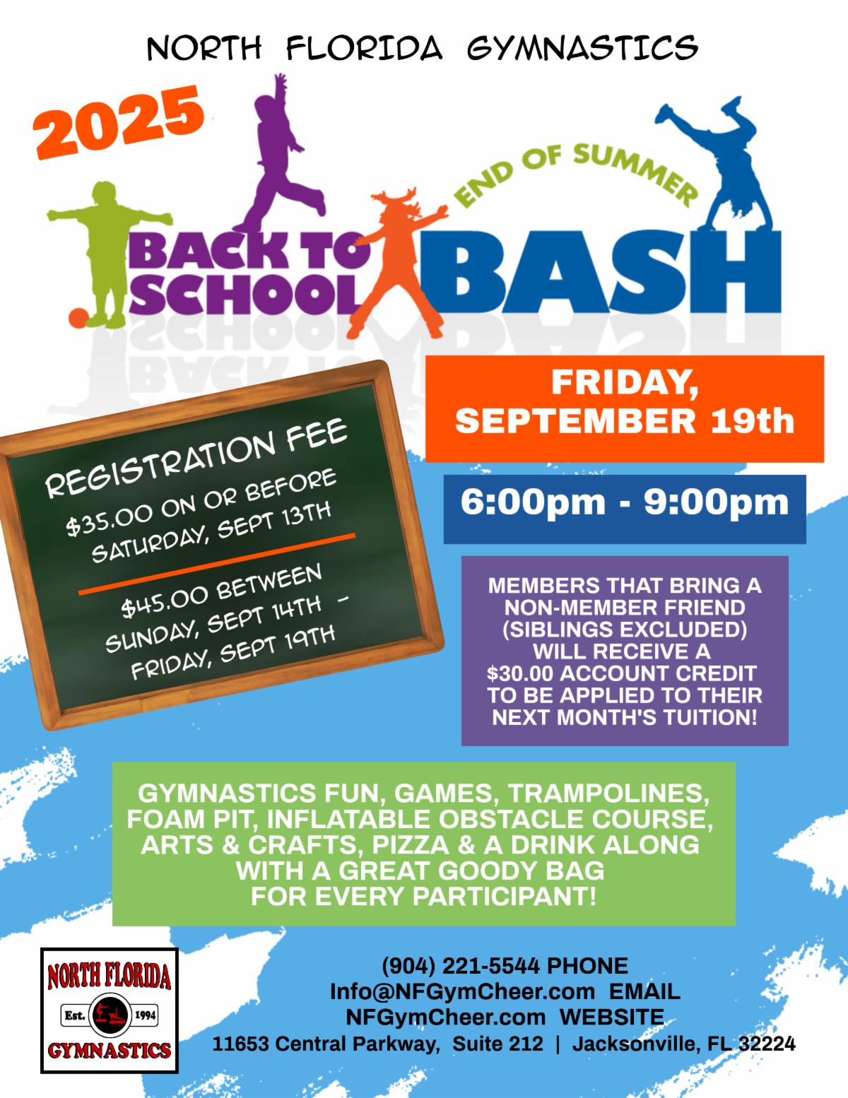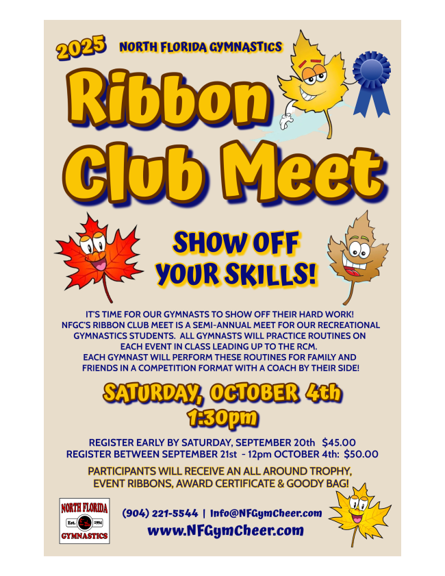 Seasonal Special Events are offered different times a year. Special Events include our Back to School Bash, National Gymnastics Day Celebration, Halloween Party and Spring & Fall Ribbon Club Meets. Prices vary based on the event.